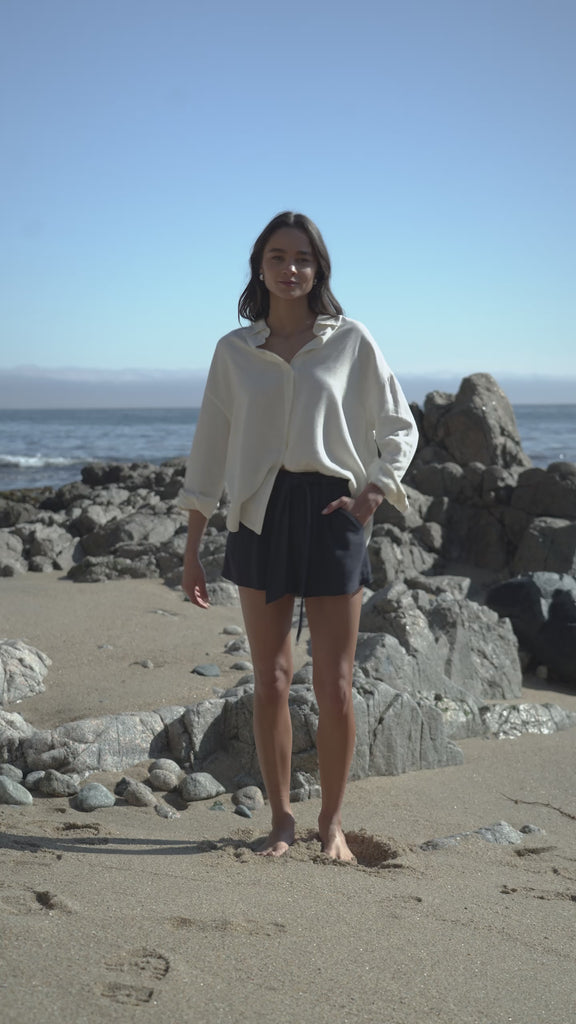La nueva Blusa Max será tu favorita para cualquier ocasión y esta vez con diseño rayado en 2 colores y 1 solido. Hecha de una mezcla de lino y viscosa, esta camisa oversize es liviana, holgada y relajada.